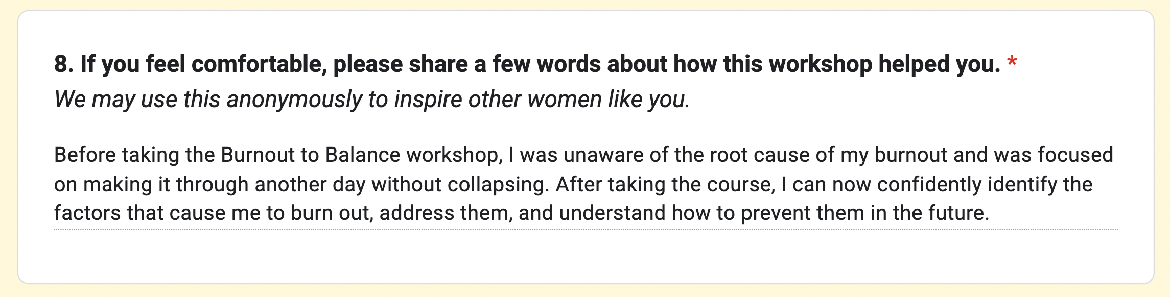 The workshop includes guided activities that show you exactly how to plug these frameworks into your life so you can identify your burnout patterns, reclaim your time and energy, and start rebuilding a sustainable life and career on day one. ($97 value)