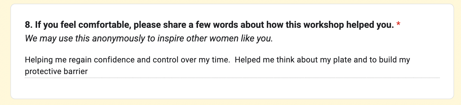 Samantha used our strategy to regain her confidence and control over her time. She gained the power, language, and tools to decide what goes on her plate, and what doesn't.Â