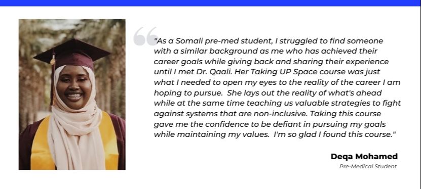 I learnt, being a woman that has both professional and has a personal goals, how to navigate both of those worlds. I am very glad to see there is a lot of young people who are consuming Dr. Qaali's teachings."